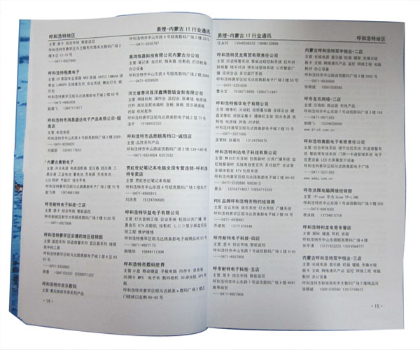 此次的内蒙古通讯录二分栏格式,让商家朋友们能够准确快速的找到自己想要的信息,本书收集了内蒙古呼和浩特、包头、乌海在内的各大城市及周边县市的IT商家信息,内容包括商家电话、手机、联系人、网址等(QQ、邮箱版本可特别订制,订制请上易搜商城)!!